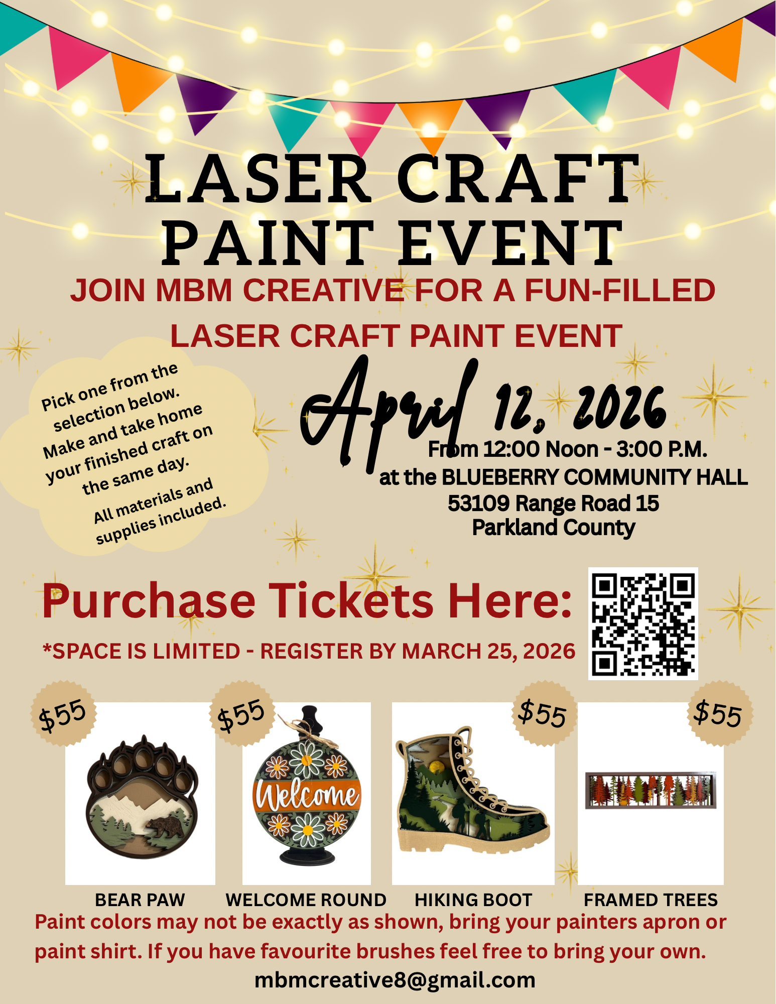 3D Laser Craft Paint Event. One night only at Blueberry Hall. Please register in advance as we will not be accepting walk ins at the door. Your spot includes your choice of design, all materials and paints and instructor assistance. You will take it home the same day. This class will have limited space so please register by March 25, 2026.